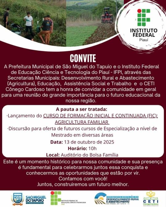 A Prefeitura de São Miguel do Tapuio e o Instituto Federal de Educação, Ciência e Tecnologia do Piauí (IFPI), por meio das Secretarias Municipais: Desenvolvimento Rural e Abastecimento (Agricultura), Educação, Assistência Social e Trabalho, e o CETI Conego Cardoso, convida a comunidade em geral, para uma reunião de grande importância para o futuro educacional da região, que será realizada na próxima segunda-feira, 13 de outubro, às 10h ( manhã) no Auditório do Bolsa Família.