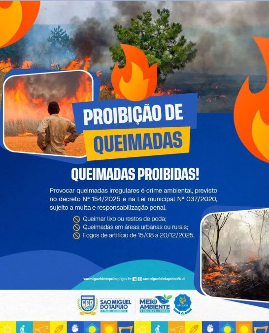 Com base da Lei Municipal Nº 037/2020, a Prefeitura de São Miguel do Tapuio por meio da Secretaria Municipal de Meio Ambiente (SEMA) reforça que, é proibido queimadas irregulares em áreas urbanas e rurais, em anomalias como: o uso do fogo, fogos de artifícios, incluindo queimadas controladas para fins de limpeza de terrenos, pastagens ou queima de lixo ou resto de poda, atos que preveem multas e outras penalidades para os infratores. Fogos de artifício está proibido de 15/08 a 20/12/2025.