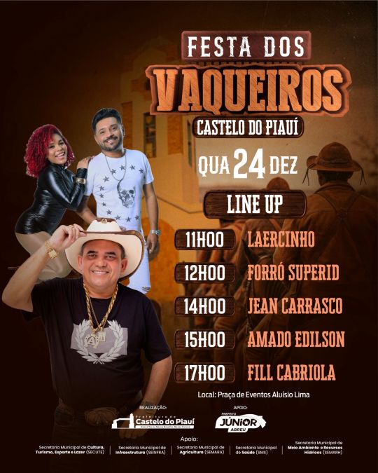 A Prefeitura de Castelo do Piauí, por meio do prefeito Júnior Abreu, divulgou a programação oficial da tradicional Festa dos Vaqueiros, que será realizada nesta quarta-feira, 24 de dezembro.