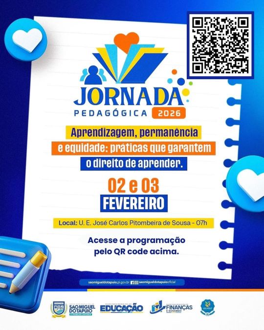 A Prefeitura de São Miguel do Tapuio, através da Secretaria Municipal de Educação (SME), realiza entre os dias 2 e 3 de fevereiro a Jornada Pedagógica 2026, evento que marca o início das atividades do ano letivo na rede municipal de ensino, como tema: Aprendizagem, Permanência e Equidade: práticas que garantem o direito de aprender.