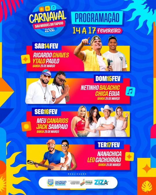 A Prefeitura de São Miguel do Tapuio, por meio do Prefeito Pompilim, divulgou a programação completa e as apresentações artísticas de cada noite - durante os quatro dias do Carnaval 2026 na cidade sãomiguelense. São grandes atrações, valorizando a cultura, a alegria e a tradição do povo.