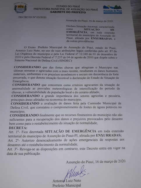 O prefeito de Assunção do Piauí, Antonio Luiz Neto, o “Netinho”, do Partido Social Democrático (PSD) decretou (003/2020), na manhã desta segunda-feira, 16 de março, situação de Emergência no Município devido às fortes enxurradas registradas em todo território local por ocorrência de alto volume de chuva.
