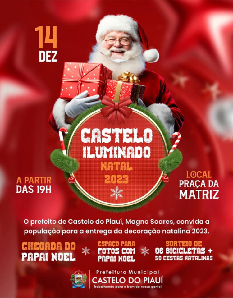 Conforme o convite do prefeito Magno, o evento natalino 2023 na cidade de Castelo do Piauí, ‘Castelo Iluminado’, acontece no dia 14 de dezembro, a partir das 19h, na Praça da Matriz, com a chegada do Papai Noel, espaço para fotos com o Papai Noel, sorteio de 6 bicicletas e 50 cestas natalinas.