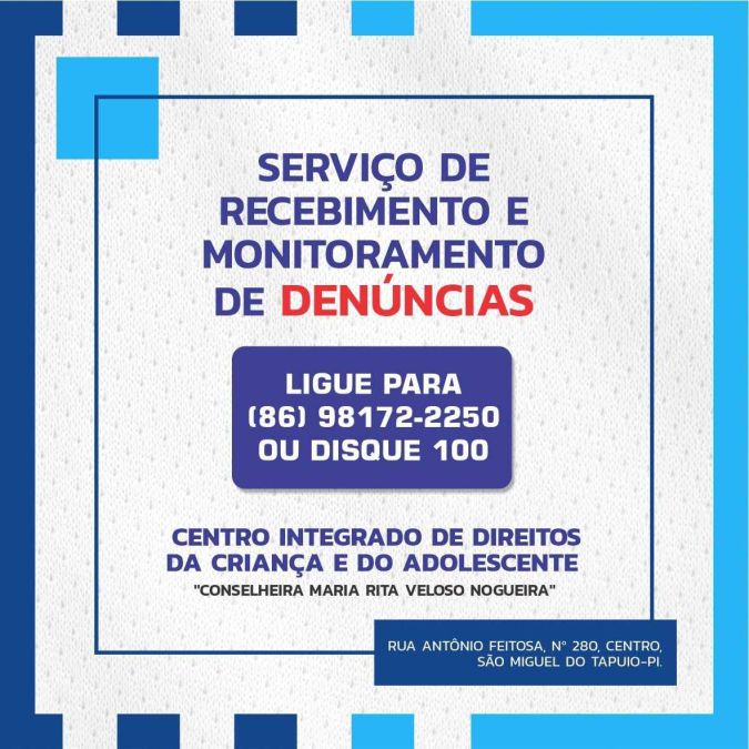 O Comitê de gestão colegiada da rede de cuidado e proteção social de crianças e adolescentes, por meio do Conselho Municipal dos Diretos da Criança e Adolescente (CMDCA), Secretaria Municipal de Promoção, Assistência Social e Trabalho, e Prefeitura Municipal, disponibiliza, a partir de agora, à população de São Miguel do Tapuio, o Serviço de Recebimento e Monitoramento de Denúncia, para que possa denunciar todos os casos de violências praticados contra crianças e adolescentes.