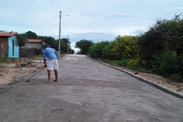 Fase de conclusão das obras de pavimentação de 3.800 metros quadrados em paralelepípedos na comunidade Cachoeira, zona rural de São Miguel do Tapuio.